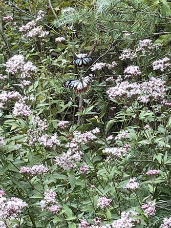オギノ邸の前の庭園にフジバカマが栽培されており、ちょうどアサギマダラが飛来してきていました。 フジバカマは、もののけの里にも栽培されており、そこでも可憐な姿を見せてくれていましたよ。 |