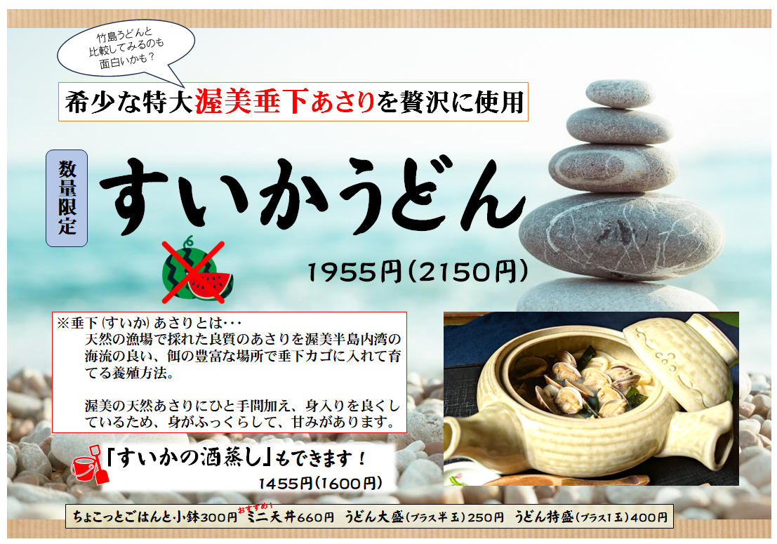 ガマゴリうどんの元祖、「竹島うどん」について 当店では、おいしいアサリのうどんを味わって頂くために アサリが旬で一番おいしい時期の『3月〜6月のみ』ご提供させていただいております。 ご提供していない季節にもその時期に応じた多彩なメニューを ご用意しておりますので是非お試しください。 ![]() |
